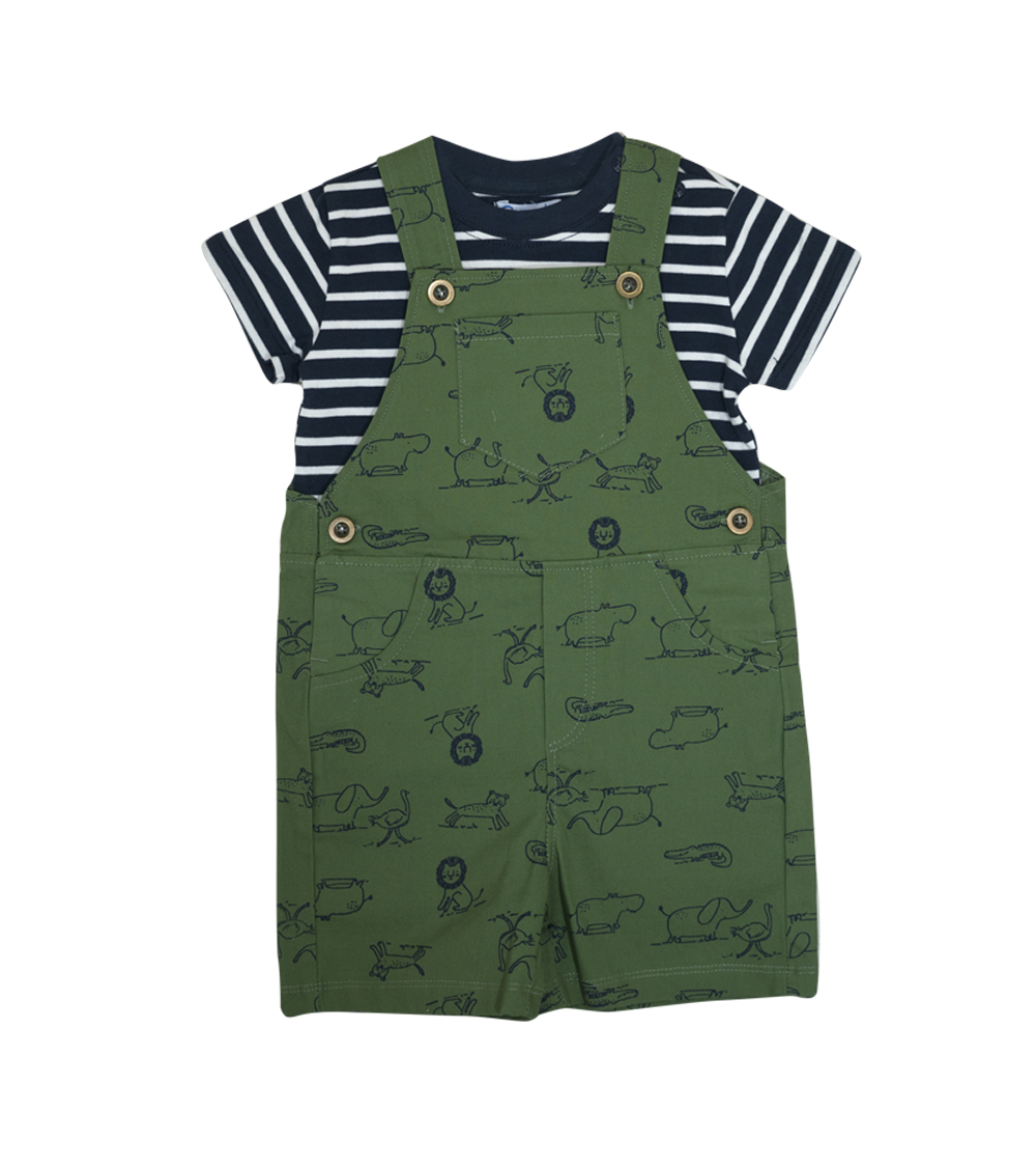 Conjunto jardinera corta color verde estampado safari y polera azul con rayas blancas , ideal para un look fresco para tu bebé.